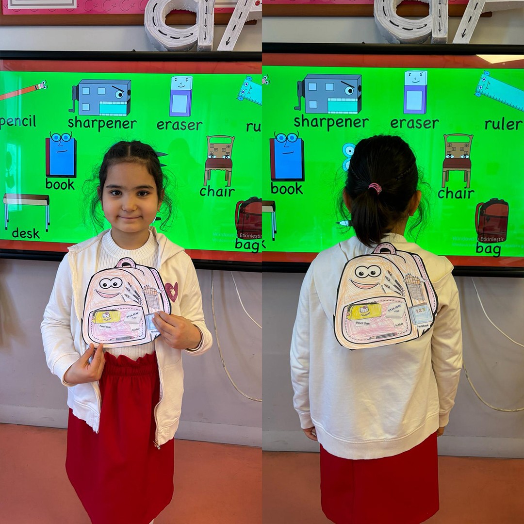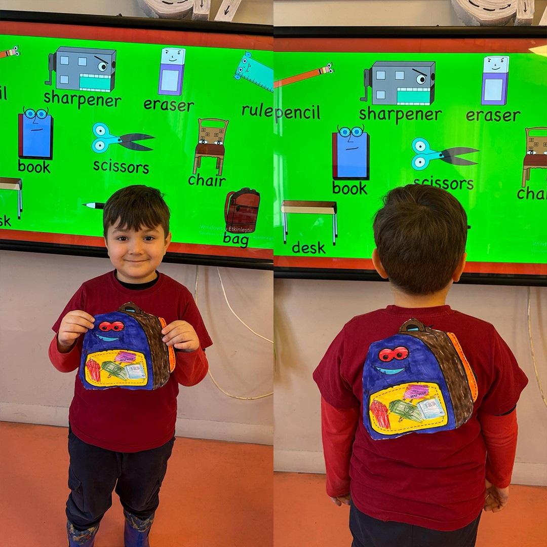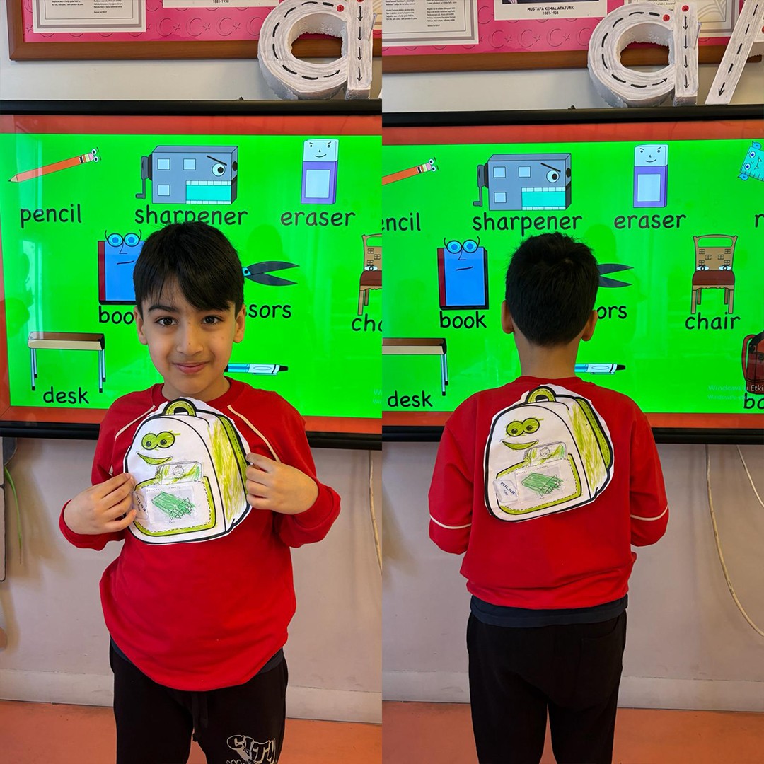 İlkokul 1.sınıf öğrencilerimizle birlikte İngilizce Main Course dersi “At School” ünitesi kapsamında öğrenmiş olduğumuz konu ve kelimeleri pekiştirmek için kendi okul çantalarımızı tasarladık. Böylece hem eğlendik he de öğrendiğimiz kelimeleri somutlaştırarak daha kalıcı hale getirdik.