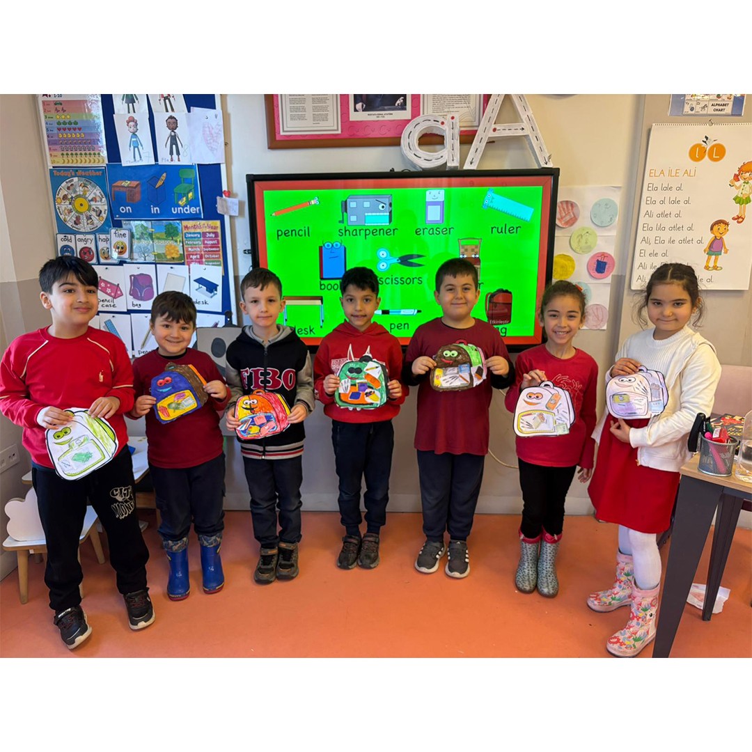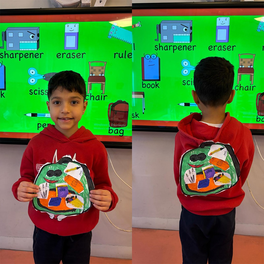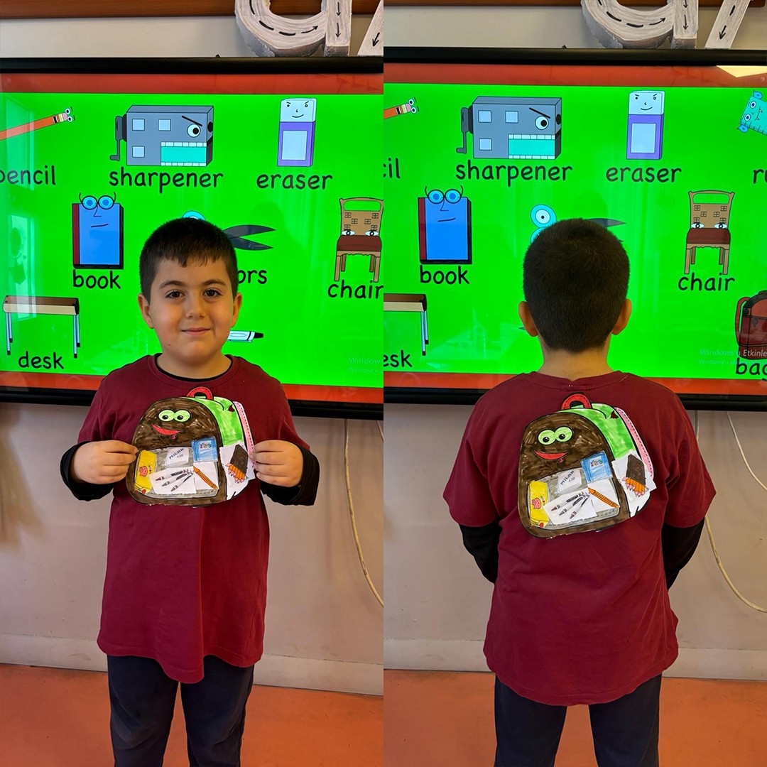İlkokul 1.sınıf öğrencilerimizle birlikte İngilizce Main Course dersi “At School” ünitesi kapsamında öğrenmiş olduğumuz konu ve kelimeleri pekiştirmek için kendi okul çantalarımızı tasarladık. Böylece hem eğlendik he de öğrendiğimiz kelimeleri somutlaştırarak daha kalıcı hale getirdik.