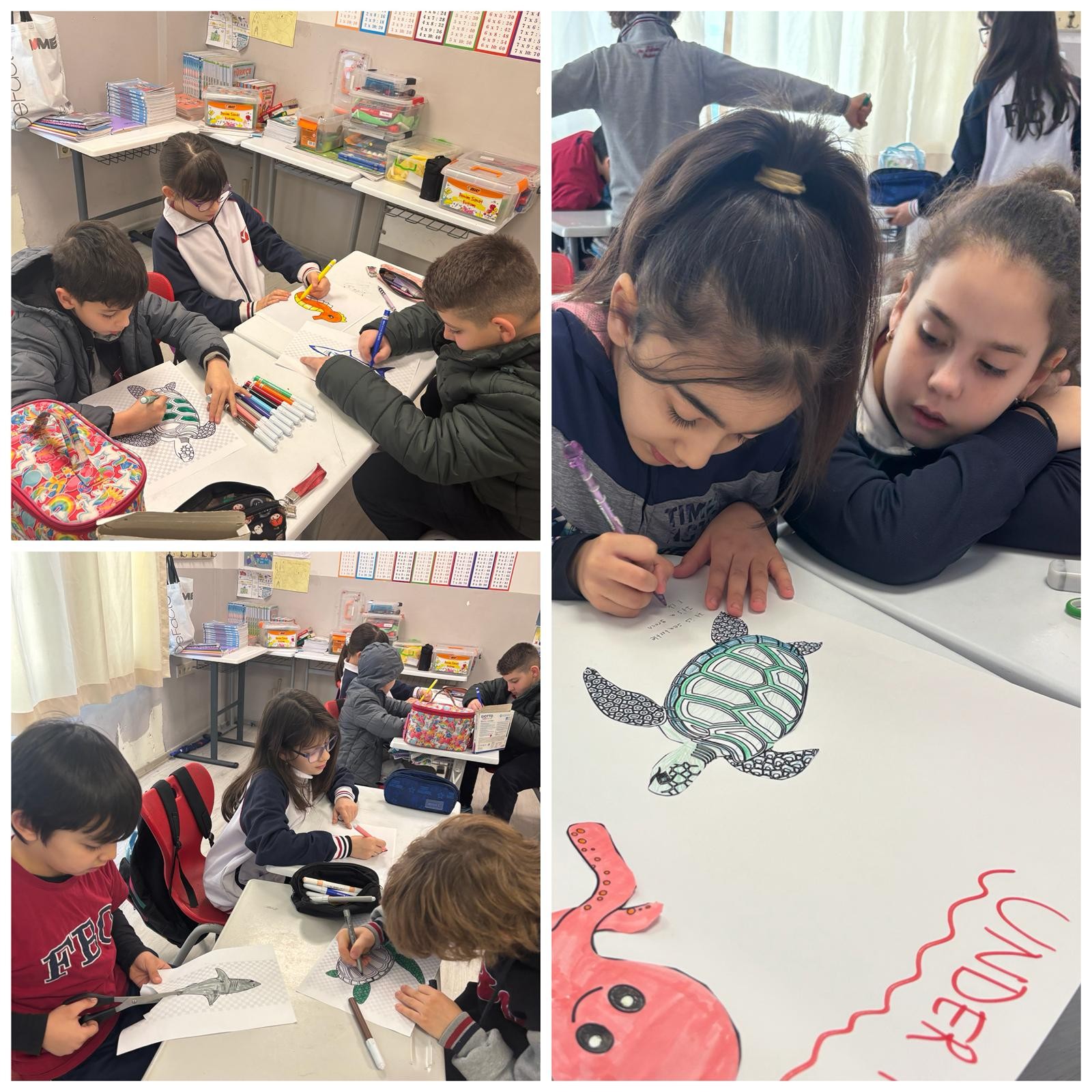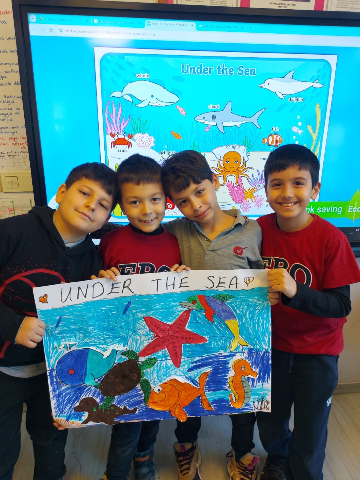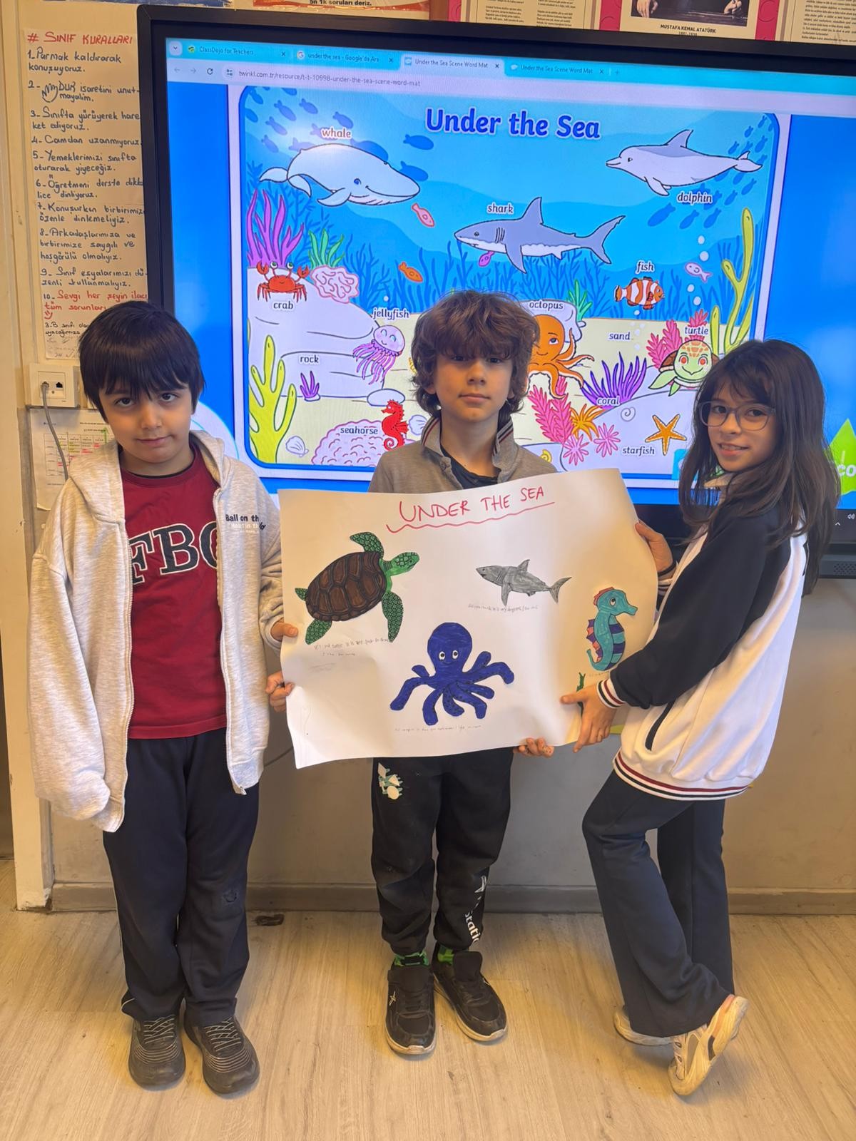 3. Sınıf öğrencilerimiz İngilizce Main Course dersinde "sea creatures (deniz canlıları)" konusu kapsamında gruplara ayrılarak istasyon çalışması yaptılar. Öğrencilerimiz en sevdikleri deniz canlılarını tanıtıp sunum yaptılar. Böylece konuyu eğlenceli bir şekilde pekiştirmiş oldular.