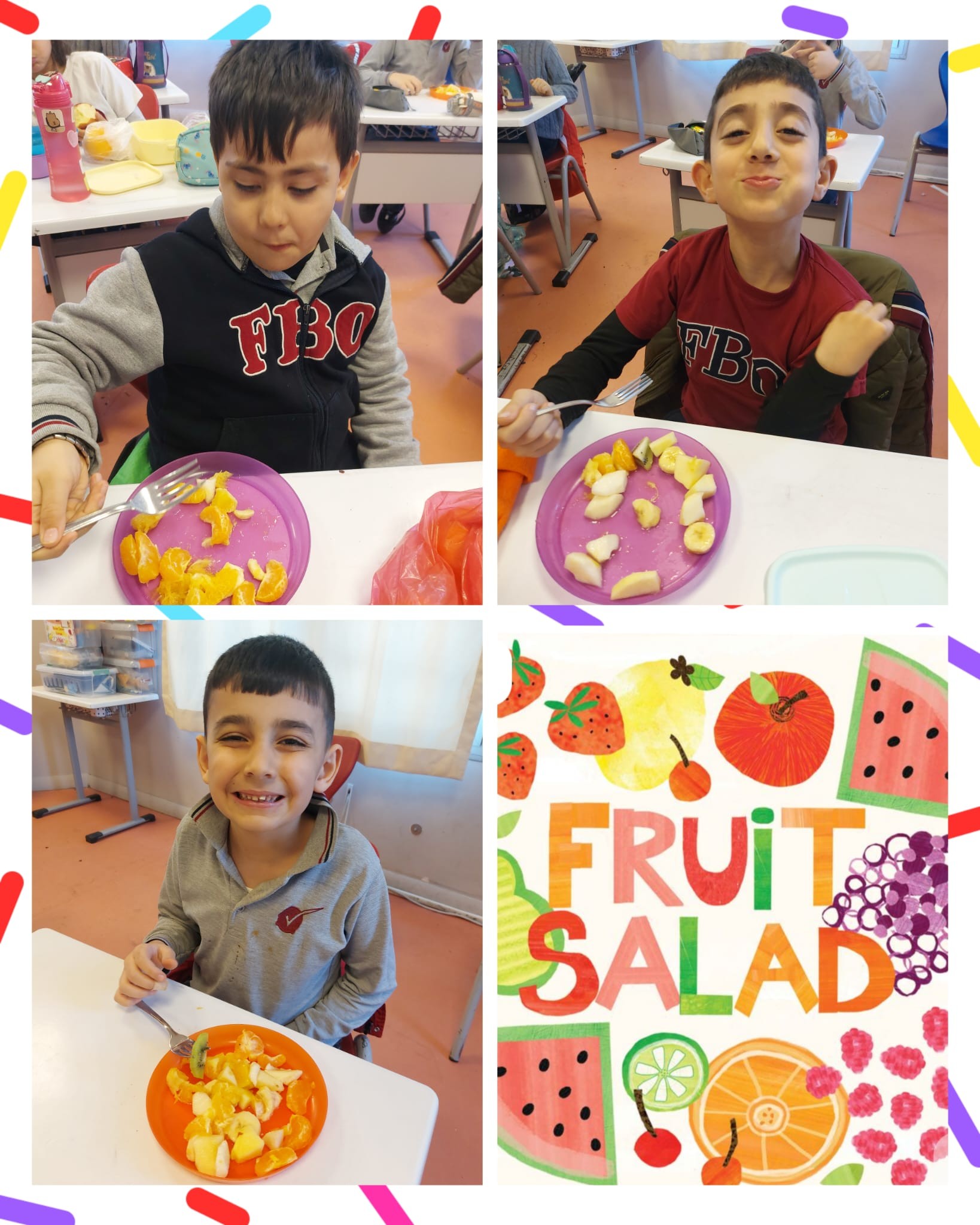 İlkokul 2. sınıf öğrencilerimizle birlikte İngilizce Main Course dersi "food and drinks (yiyecek ve içecekler)" ünitesi kapsamında öğrenmiş olduğumuz konu ve kelimeleri pekiştirmek için bir meyve salatası yaptık ve hep beraber yiyerek bol C vitamini almış olduk! Afiyet olsun!