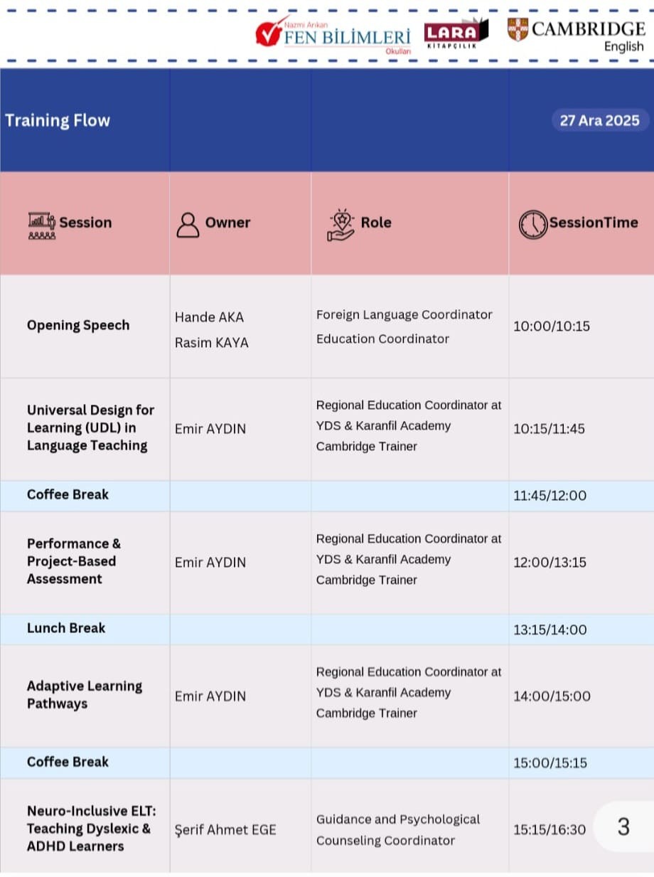 gerçekleştirilmiştir. Eğitim; Cambridge Trainer Emir Aydın tarafından UDL, Performans ve Proje Tabanlı Değerlendirme ve Adaptive Learning Pathways başlıklarıyla yürütülmüş olup, program PDR