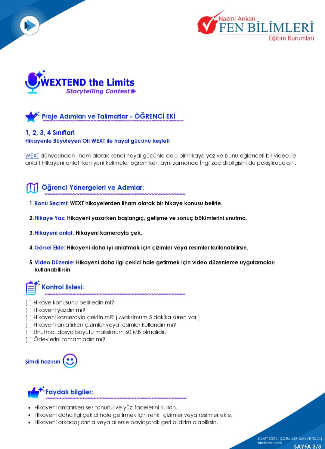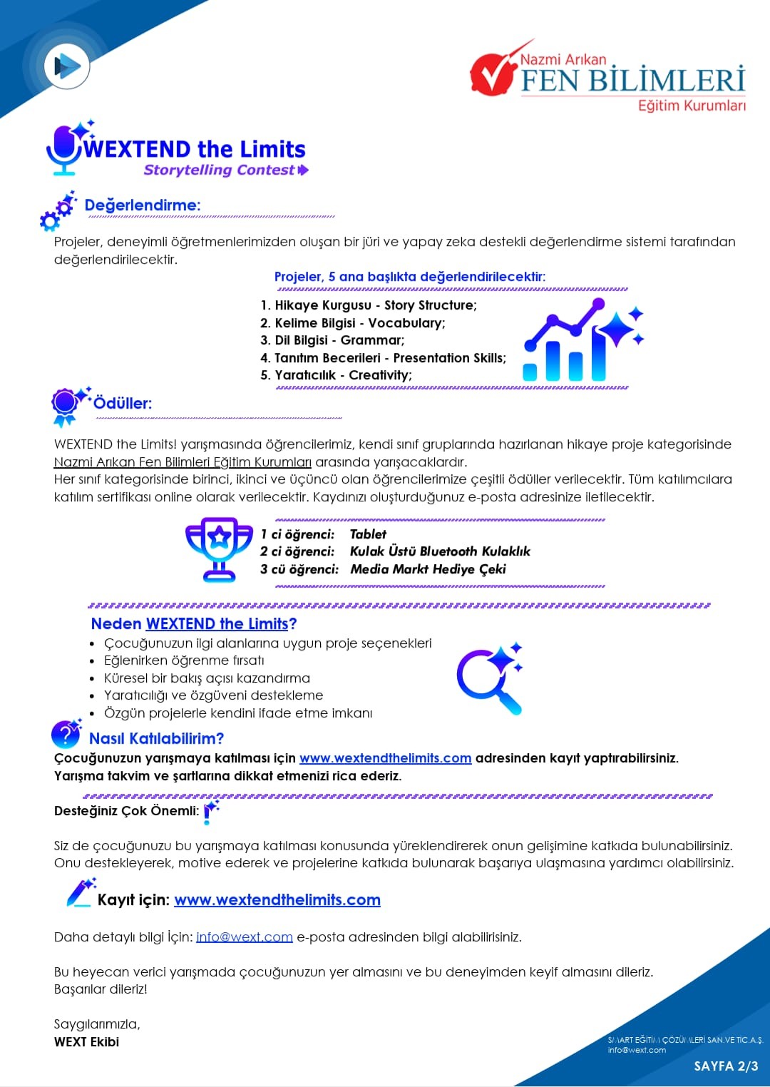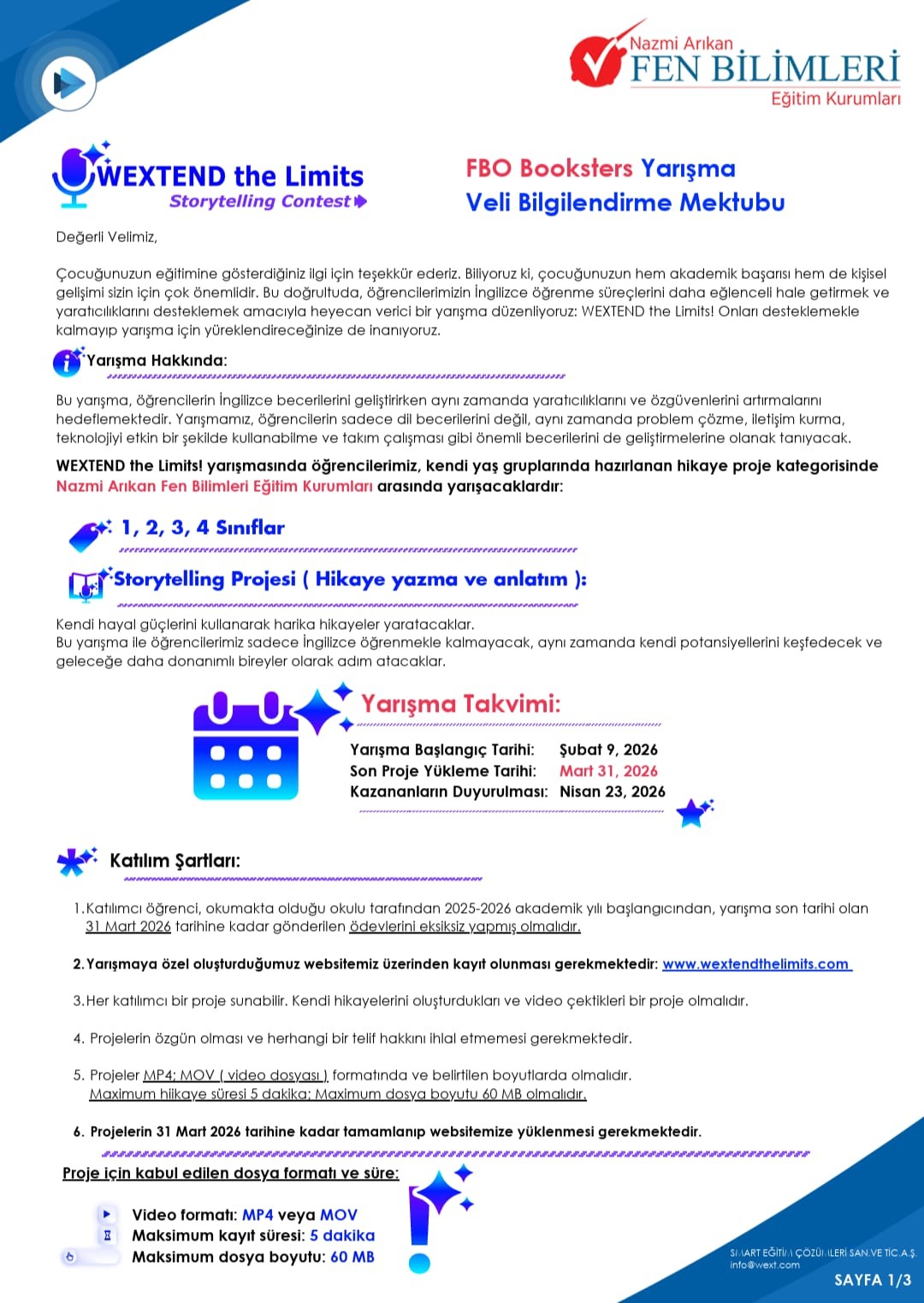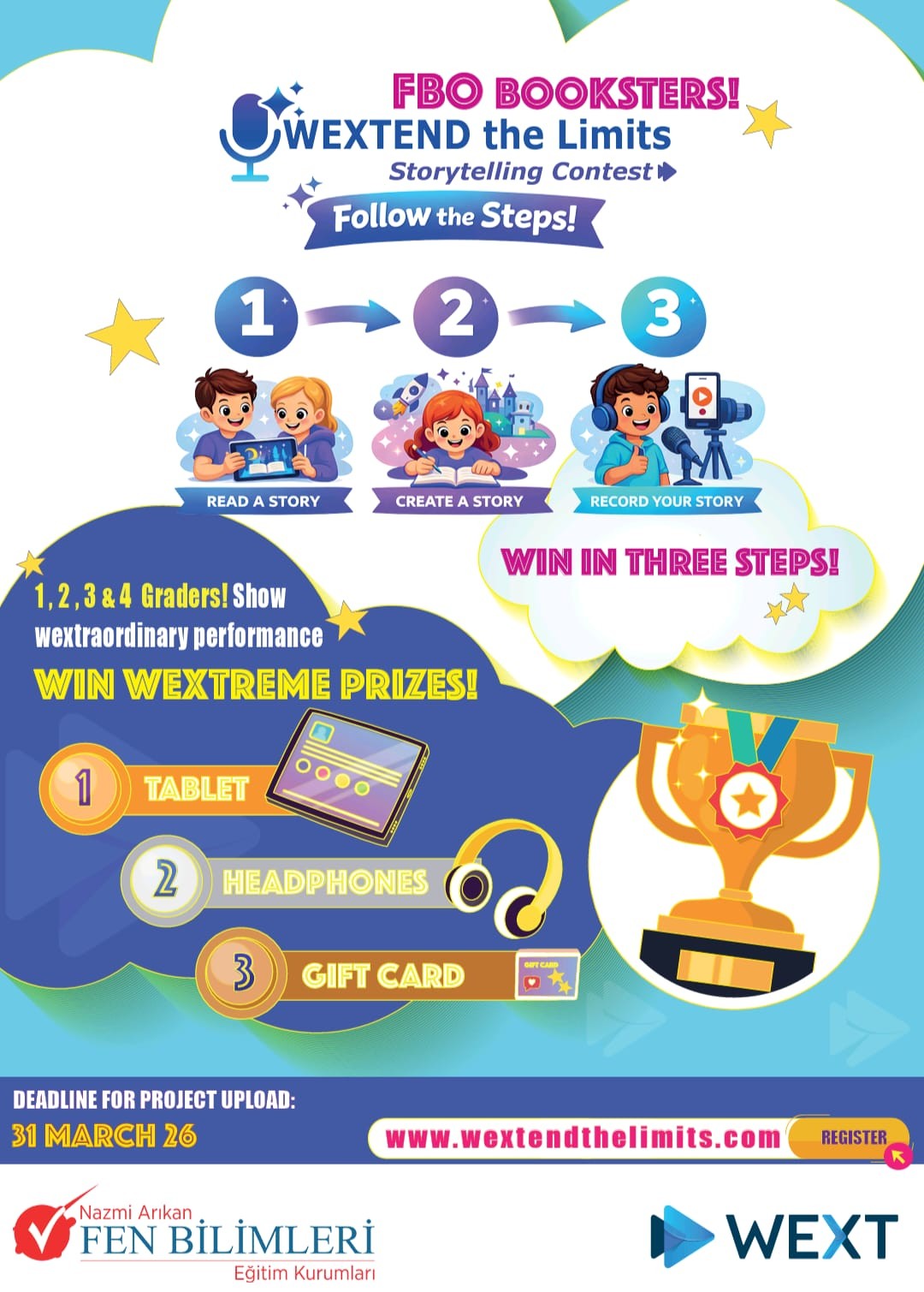 İlkokul 1.2.3. ve 4. sınıflarımızı WEXT platformunun düzenlediği " Wextend the Limits! FBO Booksters " hikaye anlatma yarışmasına davet ediyoruz. Yarışmaya katılım şartı Wext platformunda ödev olarak atanmış tüm kitaplarınızı %100 olarak tamamlamış olmaktır. İngilizce olarak yapacağınız ses kaydı veya video sunumlarınızda yaratıcılığınıza, sözlü sunumunuza, hikayelerinizi yeniden yazıp anlatma yeteneğinize güveniyorsanız bu yarışmaya mutlaka katılmalısınız. Detaylı bilgileri İngilizce Main Course ve Skills öğretmenlerinizden öğrenebileceksiniz. Her sınıf seviyesinde ayrı ayrı 1. 2. ve 3.'ler seçilecektir. Ödüller: 1.ye Tablet, 2.ye Kulak Üstü Bluetooth Kulaklık, 3.ye Media Markt' dan hediye çeki verilecektir.